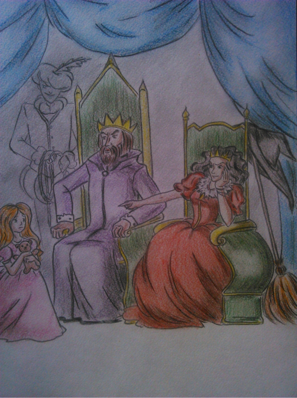 Классика: мерзкая мачеха, скрывая, что она сама ведьма, решила обвинить в связи с колдовством падчерицу, а король немного того, не в себе, конечно поверил