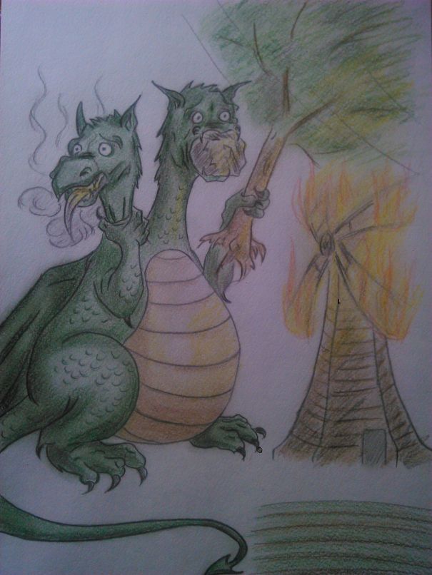 У меня двухголовый дракоша получился, пытающийся потушить мельницу, которую сам случайно и поджег