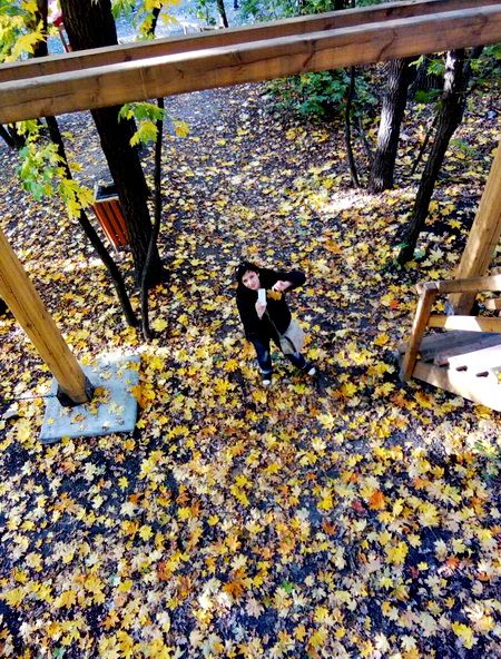 это я лежу, смотрю в небо, а на меня листья падают)) с подругой залезли на вышку в парке, дурачились, валялись на деревянных досках) она фоткала)