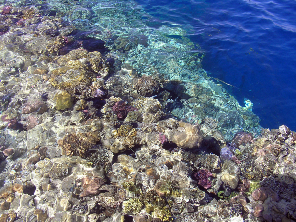 По этой мелкоте еще и волна бежит — колыхнет в районе коленок — и можно легко упасть в воду. Если риф очень старый, то больше типа камней, а между них — редкие кустики кораллов.