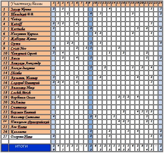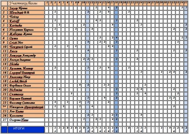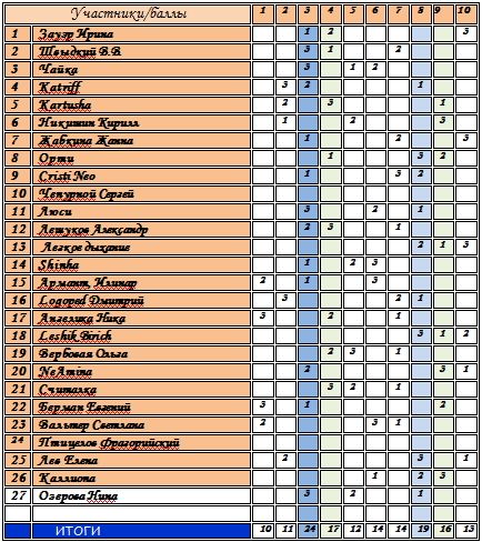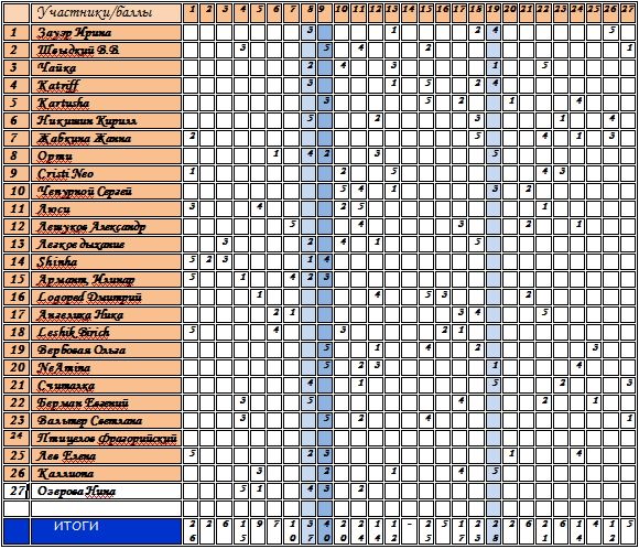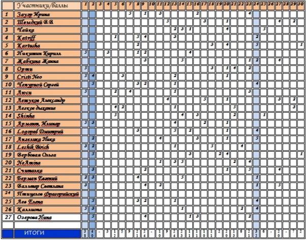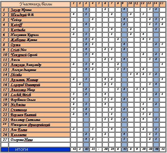 результаты (крайняя правая колонка — итоговый балл