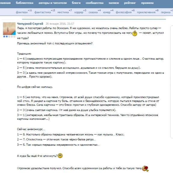 Однако, судя по количеству критиков, далеко не все потенциальные участники игры согласны с этим мнением. Далее мысль развивать не буду, разве что замечу, — как автор не обязан менять свое произведение по желанию критиков, так и критики не обязаны писать именно на конкурс. а не во внек. именно по правилам, а не в произвольной форме, и «не выдавать потоки сознания». Это их дело, в какой форме выскажут свое мнение. За них проголосуют или не проголосуют, а отчитывать тех, кто все-таки пришел высказать мнение, указывать им, что должны, а чего не должны, считаю некорректным со стороны ведущего. Так в следующий раз снова не будет кворума. Кто же захочет выслушивать поучения и втыки, как провинившийся школьник?