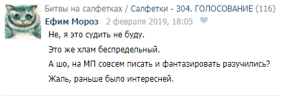 О, Ефим этим как раз и занимается. Ну давайте, зайдите в тур, где его 8-ая работа и почитайте: writercenter.ru/blog/sbattles/salfetki---304-golosovanie.html, составьте своё мнение.А вот комментарии, которые отпустил, так горячо вами защищаемый, Ефим в этом туре по отношению к работам и мастеровчанам, которые просто указали ему на правила и попросили не выражаться. Можете и диалог почитать. Если после этого вы скажете, что это человек, чьему мнению тут можно доверять, и что он делает МП лучше — я умою руки.