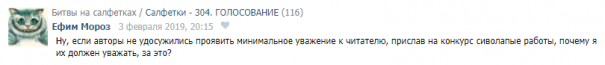 А вот комментарии, которые отпустил, так горячо вами защищаемый, Ефим в этом туре по отношению к работам и мастеровчанам, которые просто указали ему на правила и попросили не выражаться. Можете и диалог почитать. Если после этого вы скажете, что это человек, чьему мнению тут можно доверять, и что он делает МП лучше — я умою руки.
