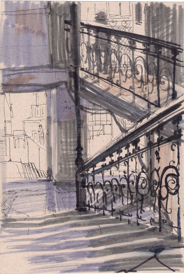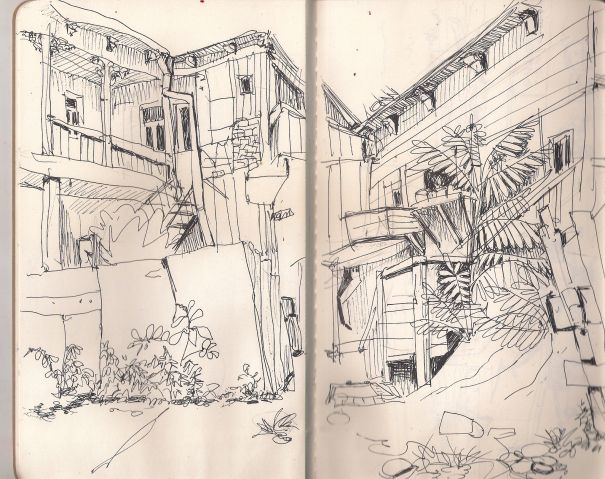 Я ездила рисовать такие домики. Это центр города. Мы видели, как из такой развалюхи выходит грузинский муж, за которым следуюет ругающаяся грузинская жена с кучкой детей, олтмахивается от всей семьи, садится в очень крутую машину и уезжает