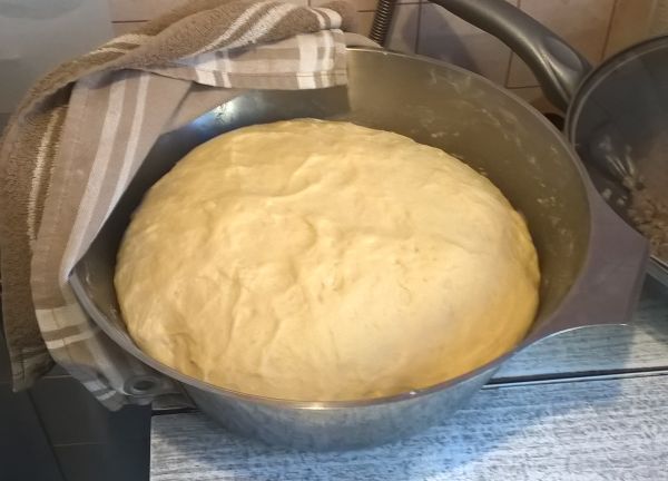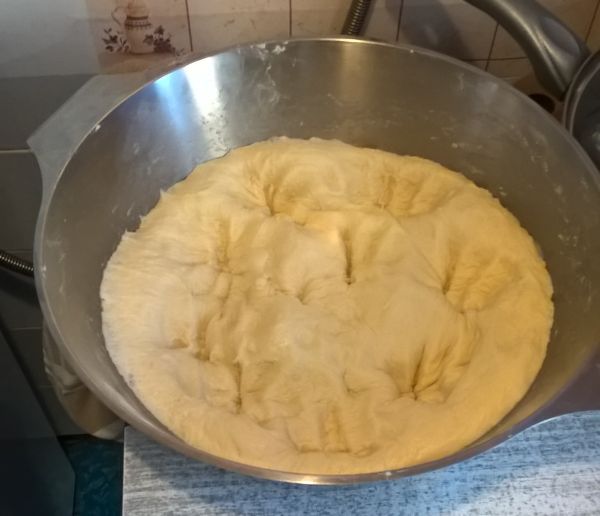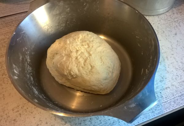 5. На самом деле, чуть больше, так как яйца большие и молоко в дрожжах… Тесто сначала жидковато получилось. И месил минут пятнадцать. Получился вот такой приятный на вид и запах кусок. И на вкус тоже