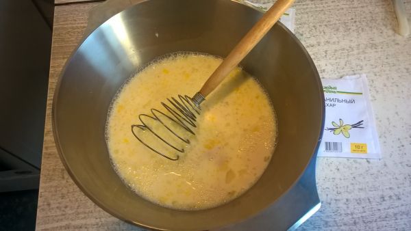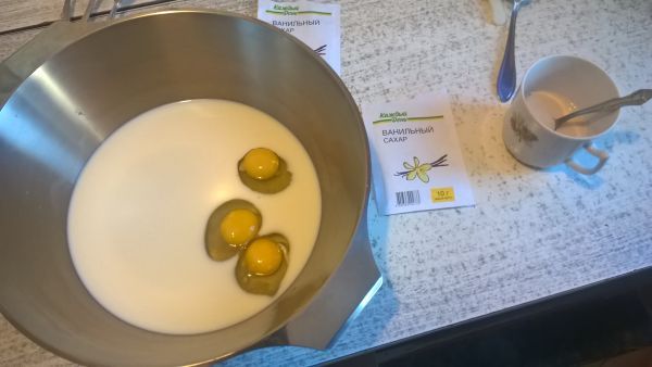 2. В поллитра молока разбил три яйца, добавил 20 гр. ванильного сахара и 3 столовые ложки сахарного песка.