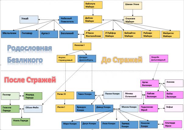 В рамках отдыха от написания романа сварганила себе наконец какое-то подобие родословной своих героев, немного или очень много спойлерная. Одна важная ветвь туда, к сожалению, не влезла, а про менее важные и говорить не приходится. Но все же пускай будет, как будет)))