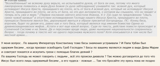 Гх, один из критиков как то обвинил мои романы о волкодевочках в пропаганде сатанизма. Пришлось долго пояснять, что Небесный Отец волкодевочек — скорее Христианский/Исламский Всевышний, чем аццкий сотона, углубившись в тонкости богословской схоластики. В частности, мне удалось опровергнуть утверждение церкви о том «что без крещения нет спасения», и пояснить насчет того что если Сатана может являтся в образе прекрасных ангелов, то и Господь может говорить с своими дочерьми в антураже гор черепов и морей крови