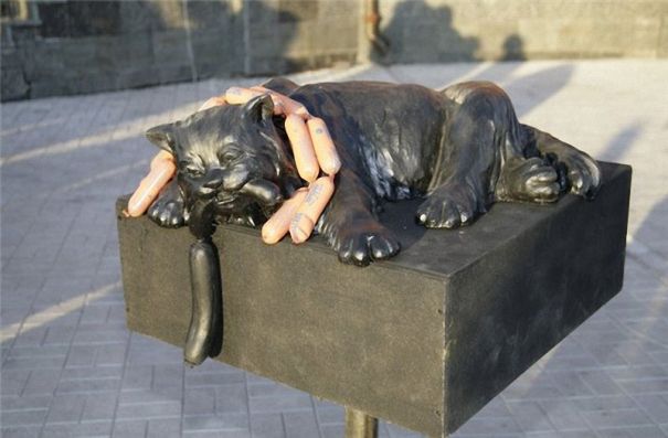 Или вот такой кот с сосисками, установленный возле мясокомбината. Если потрогать сосиску, кот скажет какую-либо фразу. Например: «Лучшая рыба — это колбаса» или «Сорок один, ем один».