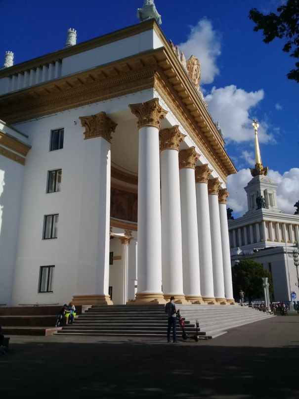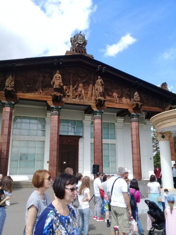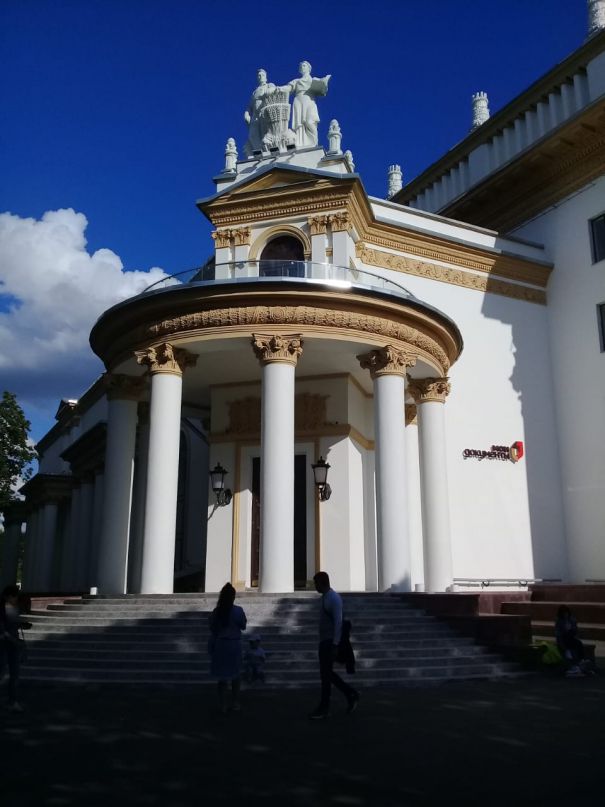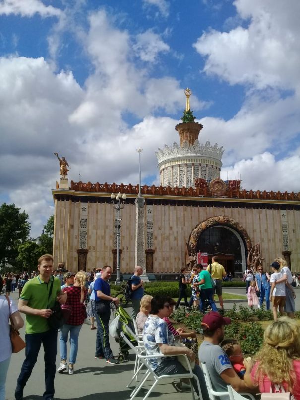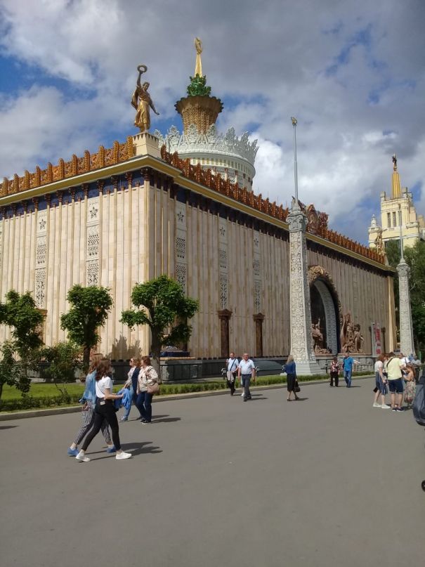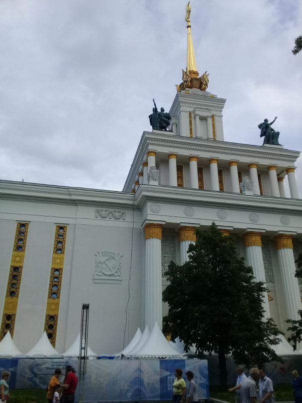 Центральный павильон. Трехярусное стометровое строение с золотой звездой построено в 1954 году Георгием Щуко и Евгением Столяровым.