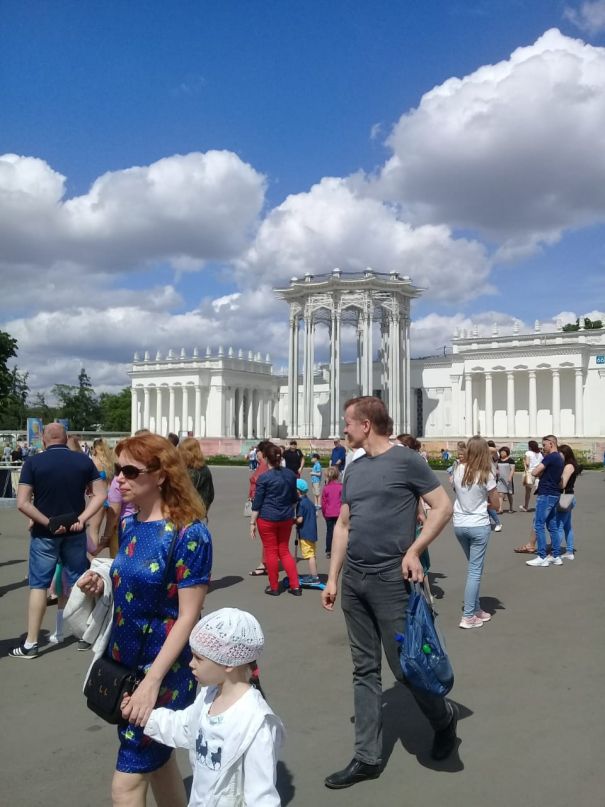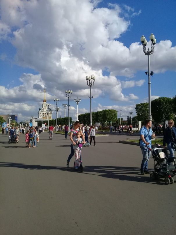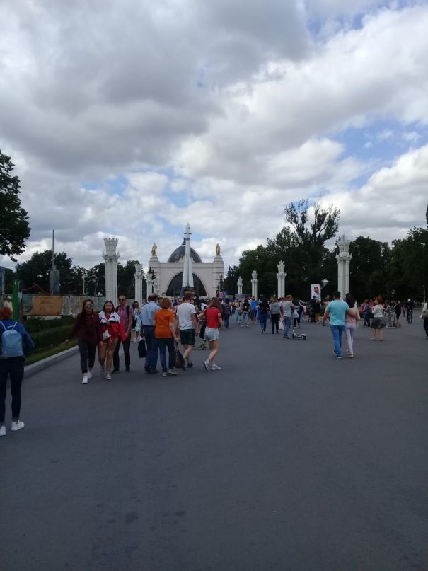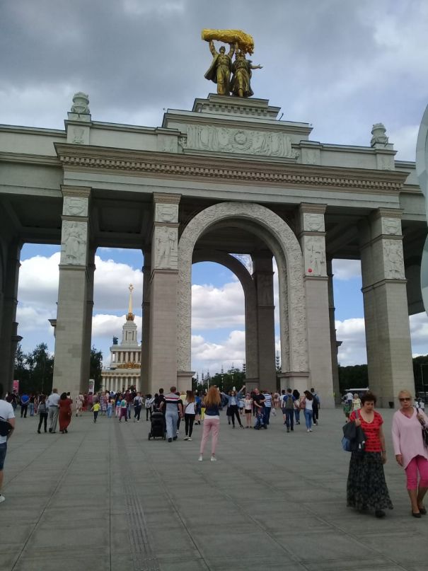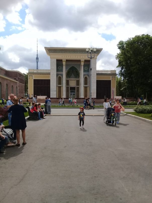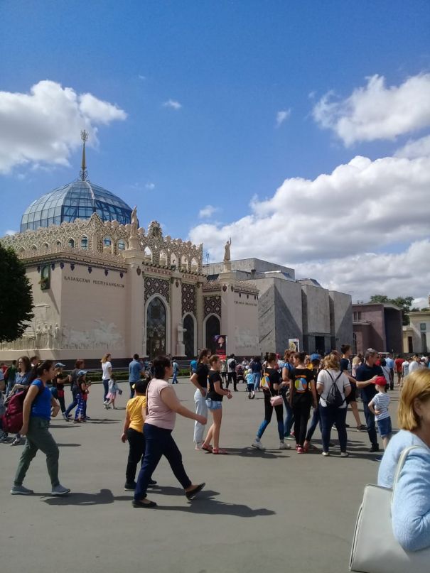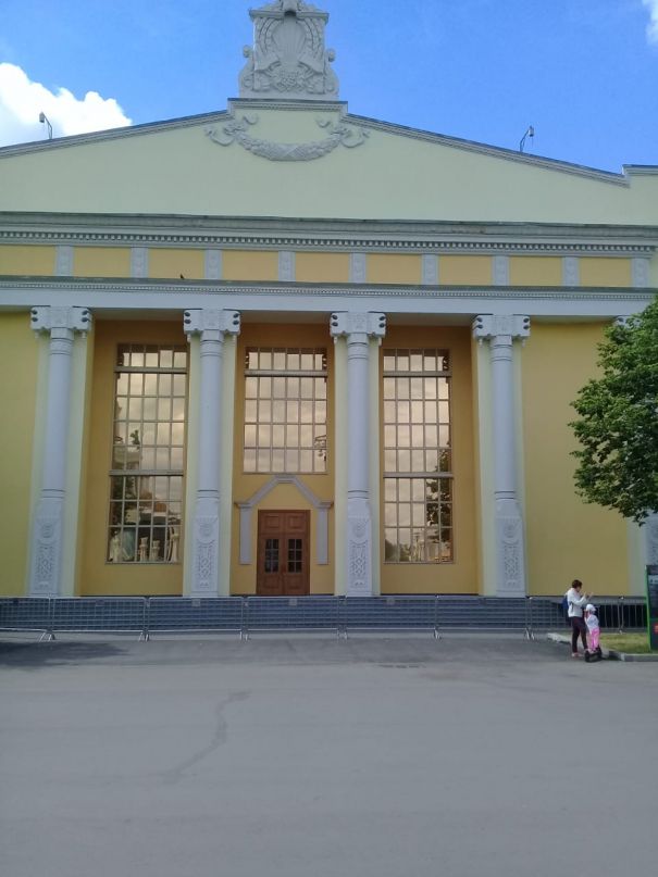 Центральный павильон. Трехярусное стометровое строение с золотой звездой построено в 1954 году Георгием Щуко и Евгением Столяровым.