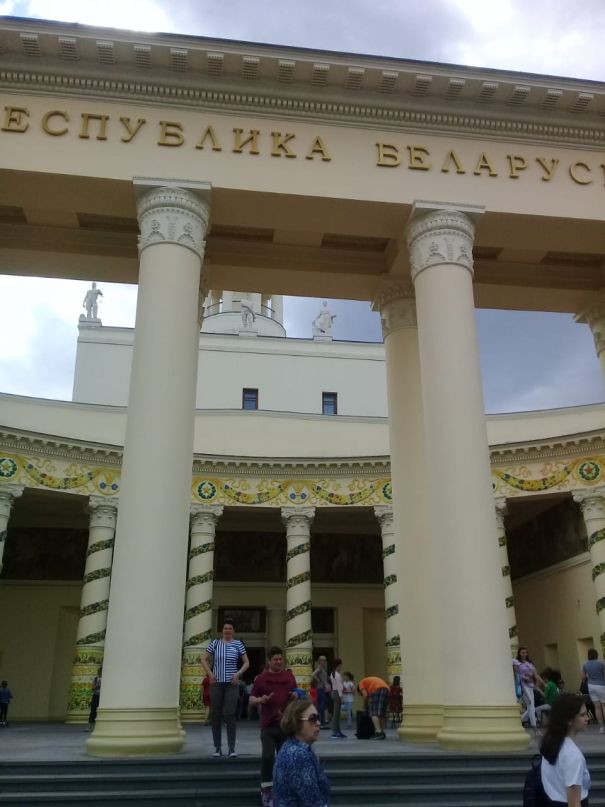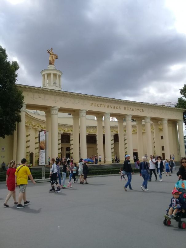 Павильон республики Беларусь построили к открытию выставки в 1937 году и выглядел он как деревянное здание, напоминающе крестьянскую избу. В 1954 году здание было перестроено в торжественном стиле по проекту архитекторов Г.А. Захарова и З.С. Чернышевой,. В октябре 2015 года павильон заново отреставрировали.