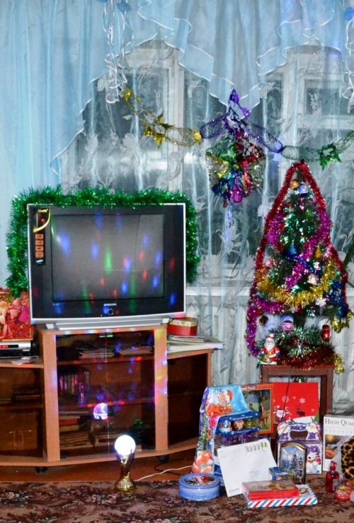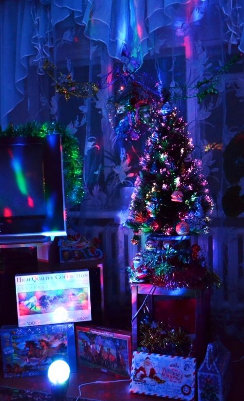 Это оба ночных варианта, на полу рядом с елкой лампа, которая пускает цветные блики, светится. Просто первый кадр снял Ротгар со вспышкой, а второй сделала я сейчас без неё (выдержка 1/15).
