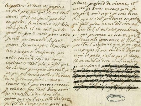 В письмах Ханса Акселя Ферзена к Марии-Антуанетте есть зачёркнутые строчки. Позже они были расшифрованы и находятся в открытом доступе. Я не поленился и нашёл одну из этих расшифровок…
