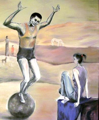 В центре сюжета — женщина стоит на шаре (не путать с «Девочкой на шаре» Пабло Пикассо и «Мальчиком на шару» (так у автора) художника-новатора Владимира Гасилова. Раньше я всегда их путал. Счас — нет!