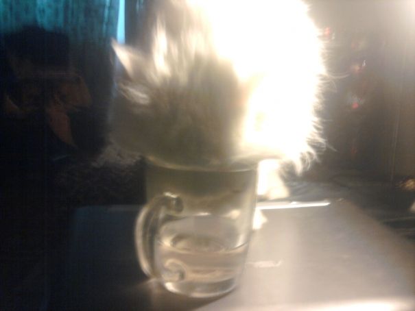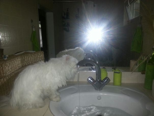 Это она уже пол-чашки выпила. А вообще предпочитает полную раковину умывальника, но если невтерпёж, то и таким образом пьёт: