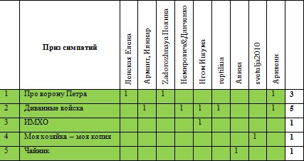 Товарищи, у нас покамест не проголосовал один участник и его несколько дней нет на сайте. Потому подождем до выяснения обстоятельств, может до конца выходных или раньше.