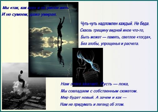 Чуть-чуть надломлен каждый. Не беда.Сквозь трещину видней иное что-то,Быть может — память, светлое «тогда»,Без злобы, упрощенья и расчета.