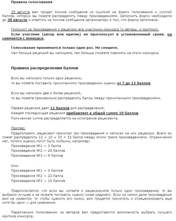Вместо того, чтобы сделать ясную и простую интерактивную разбалловку, стимулирующую людей писать рецки и голосовать, у нас тама висит невнятное нечто про будующее голосование, которое без поллитры не поймешь, да и оно будет ПОТОМ, то есть не работает во время конкурса, а включится на пару дней невидимым функционалом, что опять же не придает конкурсу аттрактивности.