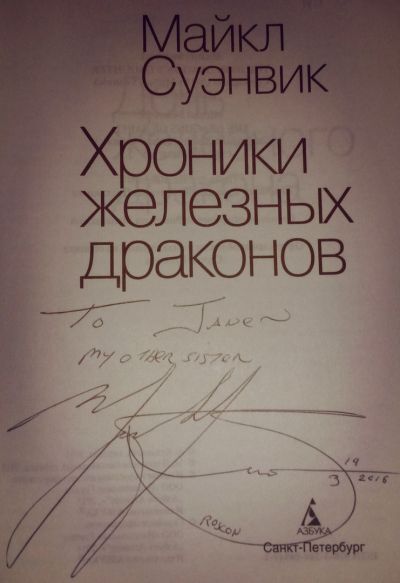 P.S. Подпись, которую Суэнвик оставил на титульном листе моего бумажного экземпляра — пусть я понимаю, что это совпадение и пустяк, но это одна из тех вещей, которая поддерживает меня и даёт мне силы в тёмные времена.