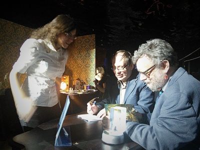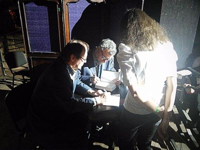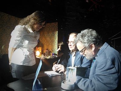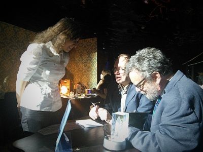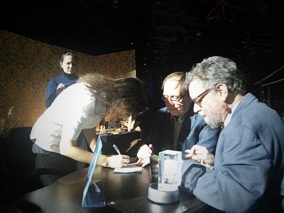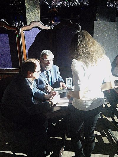 Ребята в жизни оказались ещё более клёвые, чем я себе представляла после нашего долгого общения в виртуале. Очень пожалела, что не припасла книжечки на подпись… в отличие от Вити, который прихватил с собой просто-таки целую библиотеку ромфанта — и благополучно обзавелся подписями на всё