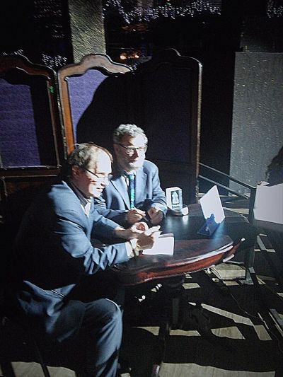 Интервью было не слишком долгим, но содержательным. Всего не упомню, и дословных ответов, естественно, не приведу… но, к примеру, Суэнвика спрашивали, что он думает по поводу этого самого Роскона и его формата, на что последовал уклончивый и дипломатичный ответ: «Здесь всё весьма… коммерциализировано». Спрашивали, не боится ли он пилить один роман по несколько лет в нашем «стремительно развивающемся мире», где тебя легко могут обскакать другие, пишущие быстрее. Суэнвик, по-моему, не совсем понял вопрос (и не мудрено), а потому ответил нечто в духе: «У всех авторов своя скорость письма; кто-то может писать быстро, и я уважаю таких людей, но я лично не могу». Спрашивали, отговаривали ли его ехать в Россию; Суэнвик ответил, что все нормальные английские и американские писатели ничего не имеют против России и глубоко её уважают, а он вообще так проникся ей в своё время, что написал свои «Танцы с медведями». Спрашивали, должен ли писатель прислушиваться к чужим советам; Суэнвик ответил, что безусловно, но тот совет, что хорош для одного автора, не годится для другого — так что, как говорится, «можно, только осторожно». Сказали, что вот у нас переводят и издают огромное количество западных фантастов, а знает ли мистер Суэнвик кого-то из современных русских фантастов? После паузы мистер Суэнвик назвал Лукьяненко и Перумова… и пауза эта была весьма долгой и красноречивой.
