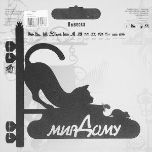 Либо кота ссадить вниз, а с кронштейна свисают сосиски. Только сосиски. Кот либо висит на них, либо стоит на земле и тянет связку вниз. Отдельно табличек не надо совсем, только как кусочки хвоста.