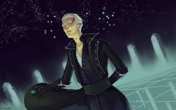 Таки вот он, эпичный арт со моим антигероем, который до этого звания дорос от «просто чувака, который должен составлять конкуренцию гг». Френц Де Вариан, в одежде из Короны что-то злобно колдует. На его лице уже заметен шрам от «неосторожного обращения с лимфой», в руке — как раз таки волшебный камушек. Ну и еще в стилистике аниме, потому что к эпичным антигероям меня приучило оно