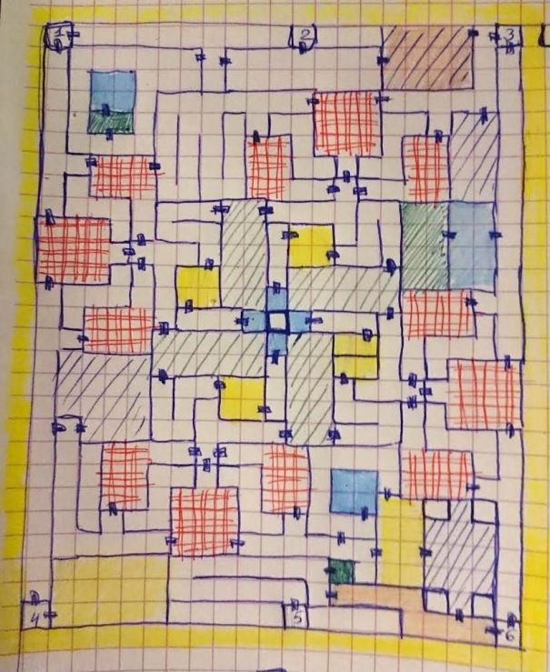 Дабы блуждания по дебрям лабиринта не стали бесконечными и я сама не запуталась в пространстве во всех поворотах направо и налево решила нарисовать карту локации со всеми комнатами и стартовыми точками команд. Хотя картой назвать это язык не поворачивается скорее уж схемой. Зеленым отмечены безопасные локации, в которых можно найти оружие, медикаменты и разные полезные предметы. Синим отмечены квест-локации, красными штрихами боевые зоны, а в желтых комнатах есть полоса препятствий.