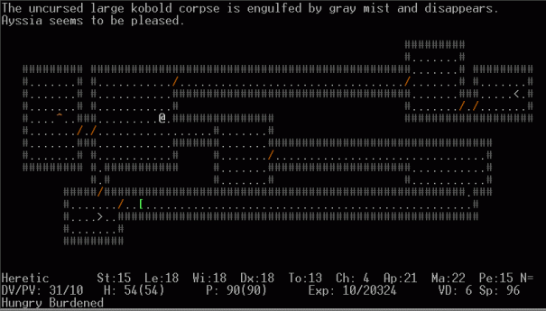 В NH очень разнообразны операции с предметами и объектами. Например, можно кушать тушки убитых монстров. Главное не слишком налегать на еду, чтобы не умереть от переедания. У каждой тушки свои особенности – некоторые из них ядовиты (кстати, вNethack можно постепенно приучить себя к ядовитой пище), а съев, например, летающий глаз, вы получите телепатию. При этом, чтобы телепатия была активна, вы должны ослепить себя. Для этого есть множество способов, как безвредных (надеть на голову полотенце или повязку для глаз), так и неприятных – съесть протухшую еду (да, еда портится со временем; и не факт, что ослепнете, это лишь один из возможных исходов), или быть ослепленным вспышкой молнии.