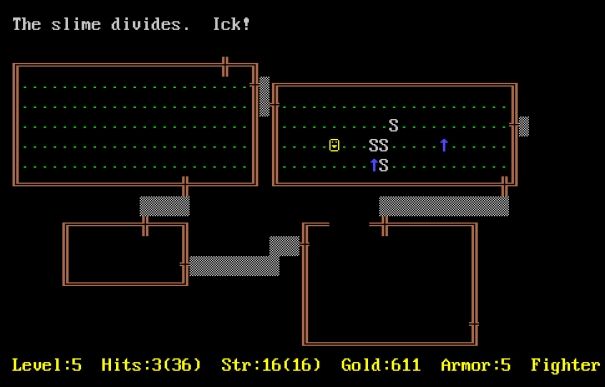 Затем людям наскучило вбивать команды кодом в компьютер. Так появились первые символьно-текстовые RPG – Roguelike. Название жанра берет начало от одной из первых символьных RPG – Rogue (англ. бродяга). Теперь игроки не просто читали стены текста, а смотрели на происходящее «сверху», и о нажатиям кнопки могли воевать и перемещаться по случайно сгенерированной локации, «нарисованной» ASCII-символами. Эта схема оказалась довольно удобной, создавала удобный интерфейс для взаимодействия для отображения мира игры и взаимодействия игрока с окружением. В те времена в таких игра были заложены и отработанны многие принципы, которые применяются и поныне.