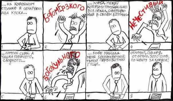 А если бы я была автором этого комикса, то нарисовала бы еще продолжение про Стивена Кинга, то там было бы про описание одного и того же дома на протяжении 5 глав с разных точек зрения. А за кем еще из известных авторов замечали такую склонность к словесному поносу?