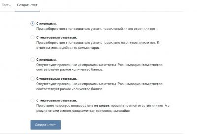 В контакте можно делать тесты только по схеме №3 (с накоплением баллов за ответы. Либо просто «верный — неверный ответ» без баллов, как в ГАИ