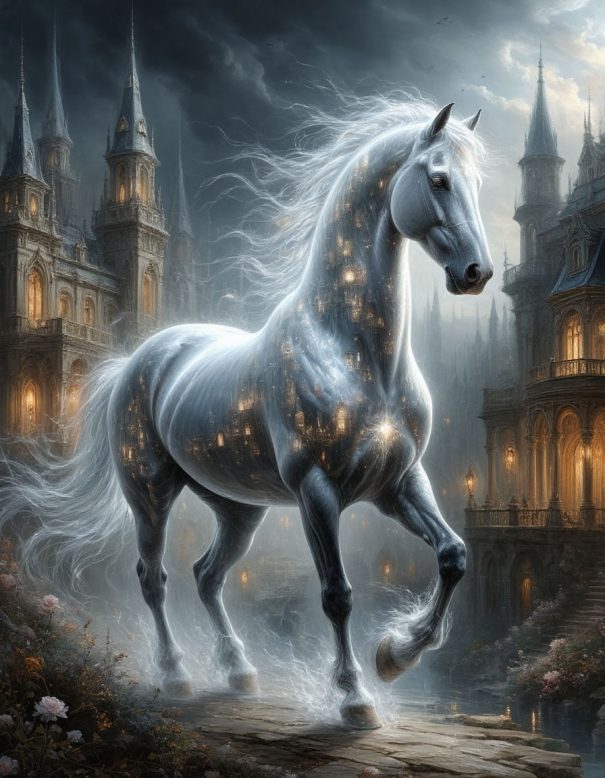 И вот в глубокую ночь, под стрекот цикад и кваканье лягушек, я выбрался из окна и направился к стойлу. У коня были невероятно большие глаза, словно в них затаилась бездна. Я набросил на него уздечку, животное встрепенулось и согнуло колено, припав к земле, будто приглашая сесть. Я взобрался на него и только заметил, что копыта вывернуты задом наперед. Животное в мгновение ока вынесло меня в поле, и мы оказались у озера.